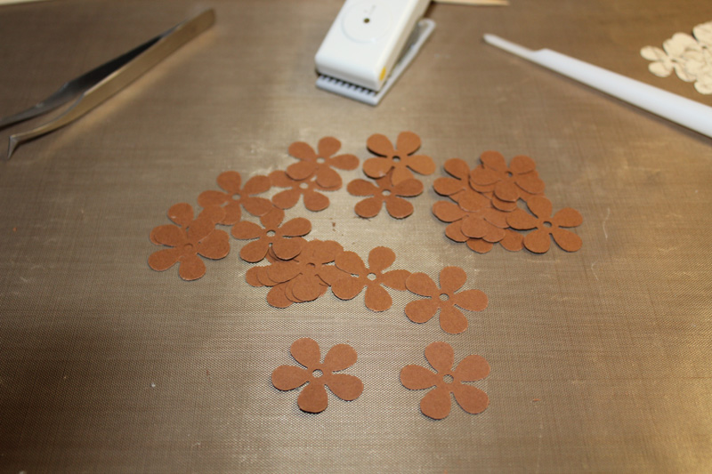 Start med at udstandse 22 styk retro blomster. Lav med blyant en prik i midten af hver blomst så er det nemmere når man nu skal lave et hul i midten af hver blomst med en hultang.