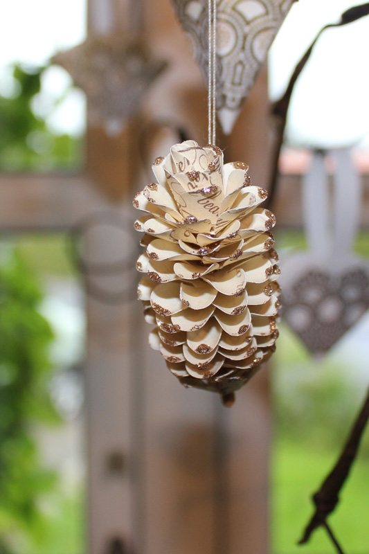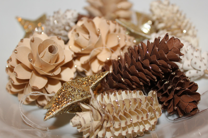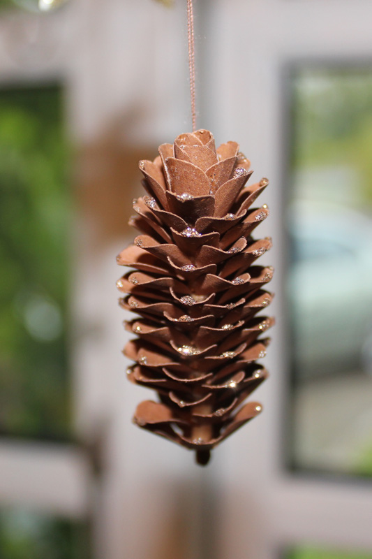 Når alle bladene er monteret stilles pind og kogle til side til tørring og den skal være helt gennemtør før man piller mere ved den. Herefter kan man forme lidt på de enkelte skæl hvis der er nogen som skal justeres i retning. Nu duttes en lille limklat på toppen af hvert kogleblad og så drysses hele koglen med glitter. Hæld det overskydende glitter af og stil koglen til tørre igen.