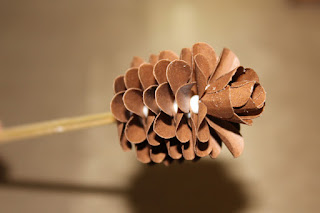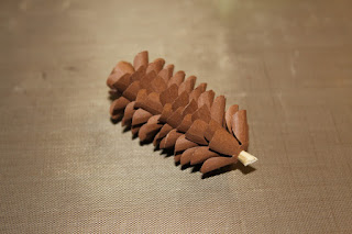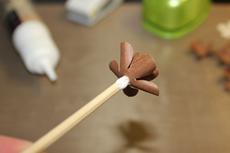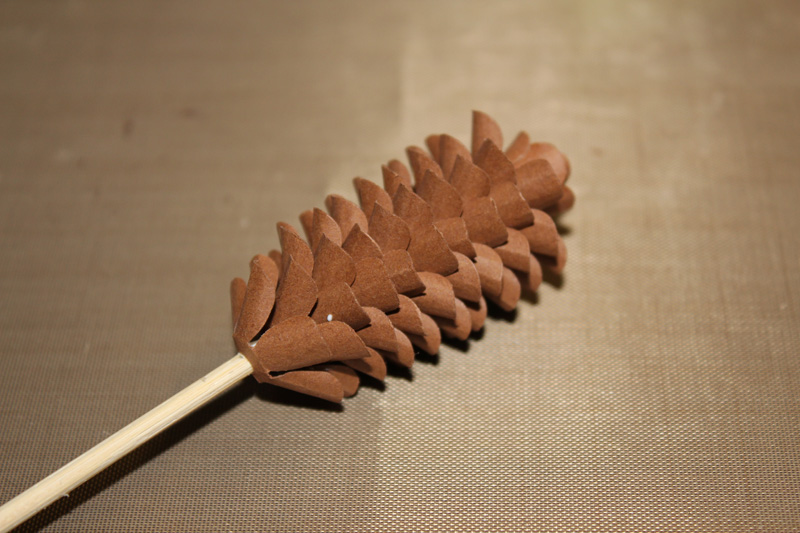 Nu fortsætter man med lim på pinden og montering af koglebladende med Ca. 1 mm mellemrum. brug den anden blomster pind til at skubbe og justere koglebladene på plads.