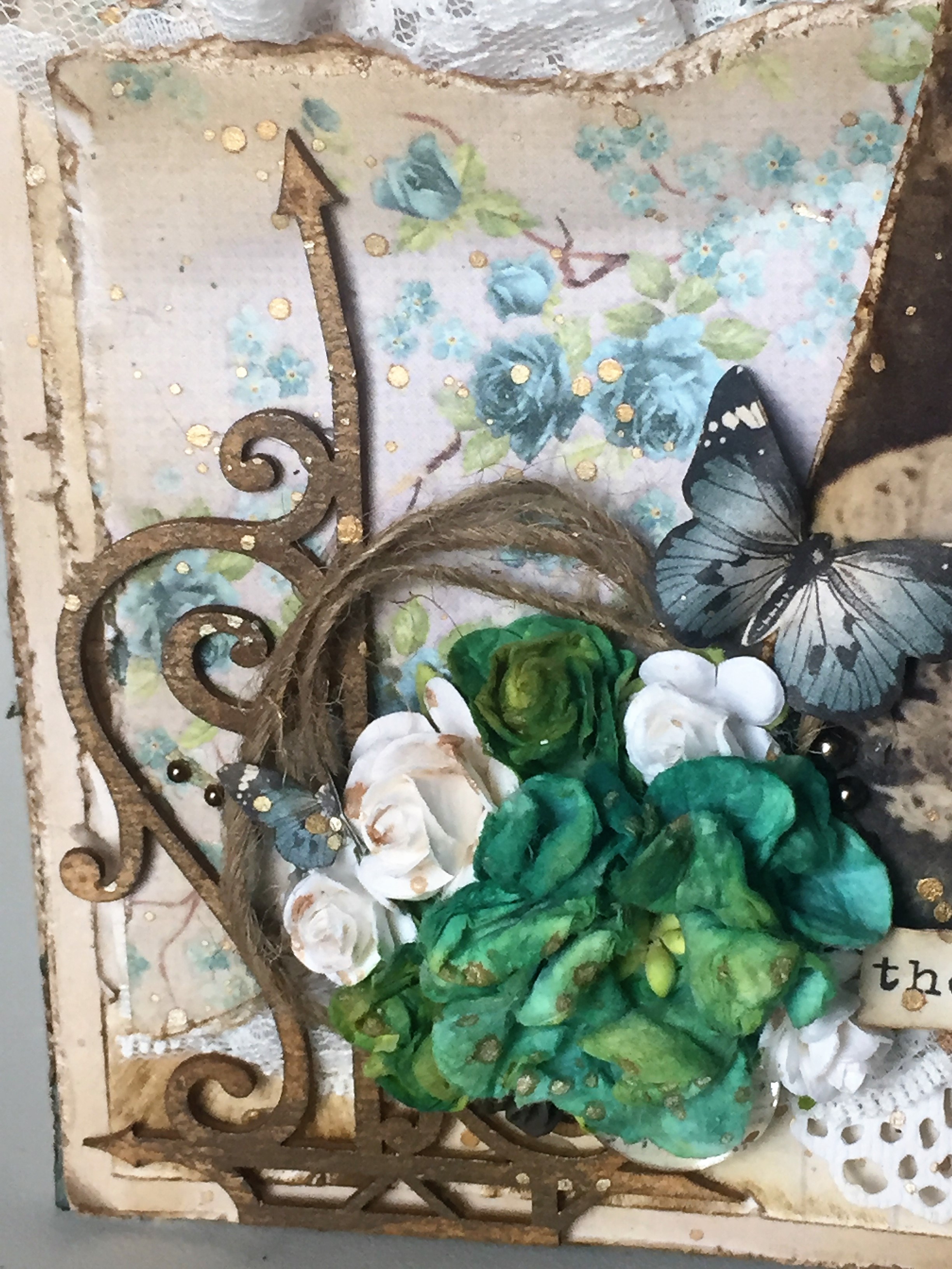 Pynten består af hvide blomster og grøn/blå blomster, som jeg selv har farvet med distress inks.